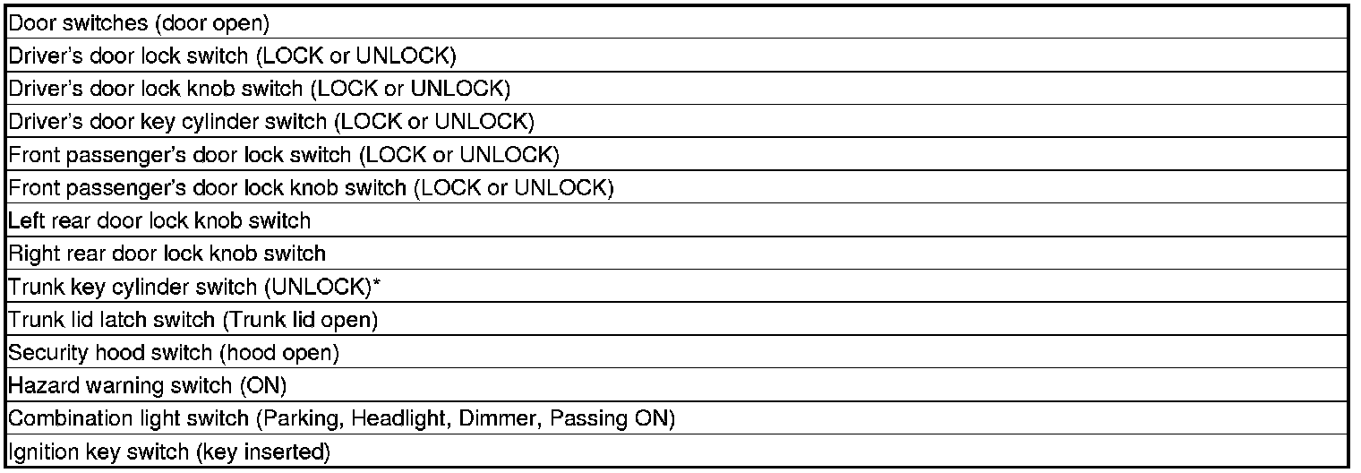 NOTE: If any control unit is faulty and will not wake up, several circuits in the system will malfunction at the same time. In the table, the control unit is followed by a list of the switches and input signals that can wake it up.