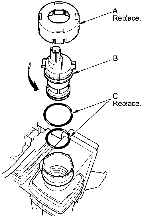 Install the parts in the reverse order of removal with new O-rings (C) and a new cap.