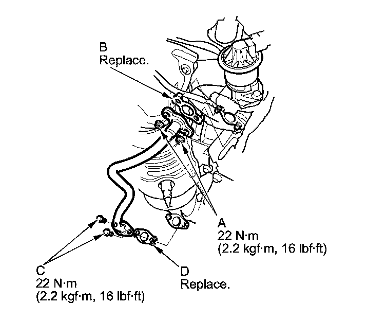 2. Install the EGR pipe on the TWC side, and tighten the bolts (C) with a new gasket (D).