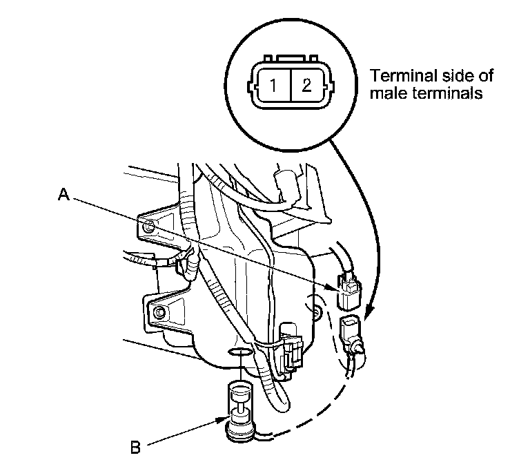 2. Disconnect the 2P connector (A) from the washer fluid level switch (B).