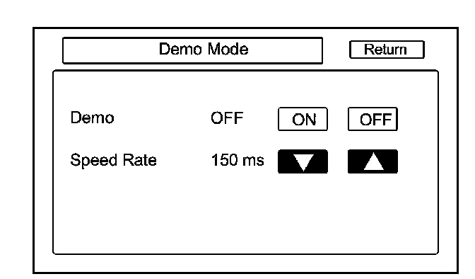 This screen is for factory use only, and should always be set to OFF. Occasionally the DEMO setting is turned ON when vehicles are being used at Auto Shows or similar events. Turning this feature on, allows the navigation system to automatically follow a route to a destination when the vehicle is stationary. The Speed Rate changes the speed of the demo mode.