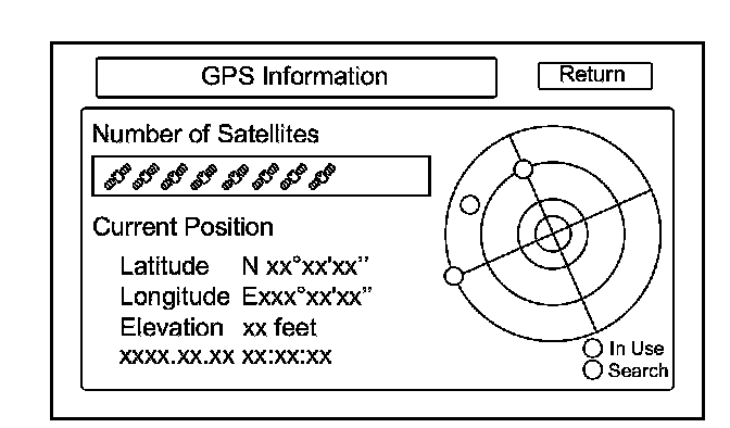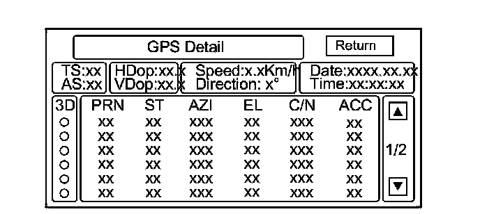 By pressing and holding the MENU button for 2 seconds, a GPS Detail screen appears. This screen displays real time incoming satellite positional data when the vehicle is outside in the open. The information shown on this screen is for factory use.
