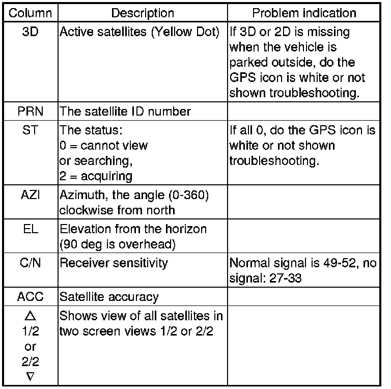- If the row of data in the table below begins with a yellow dot, the AZI and EL fields can be used to locate each satellite on the circular GPS diagram (see prior screen).