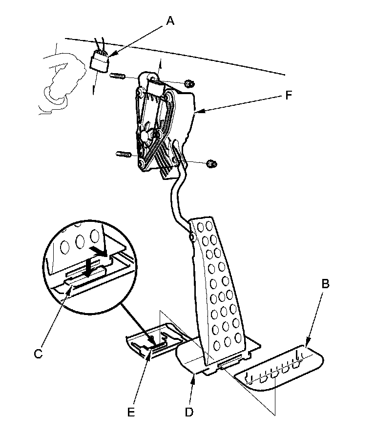2. Install the accelerator pedal module (C) with a new clip (D).