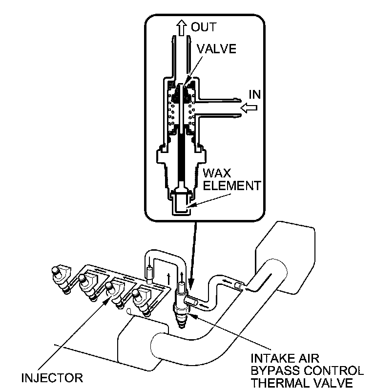 When the engine is cold, the intake air bypass control thermal valve sends air to the injector.