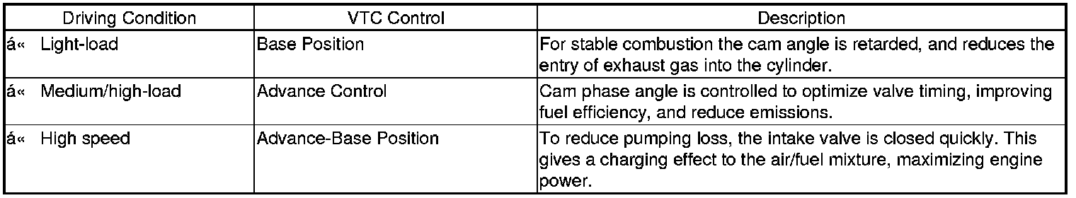 - The VTC system makes continuous intake valve timing changes based on operating conditions.