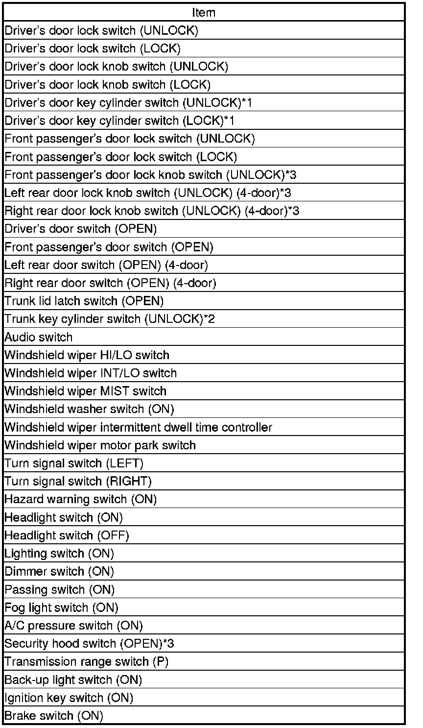 11. The following tables list the circuits that can be checked in Test Mode 2. Operate the switch that is most closely related to the problem. If the circuit is OK, the ceiling light will blink once. If the circuit is faulty, there will be no indication.