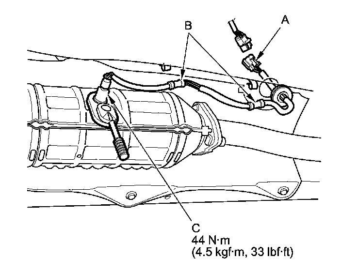 Disconnect the secondary HO2S 4P connector (A) and the clips (B), then remove secondary HO2S (C).