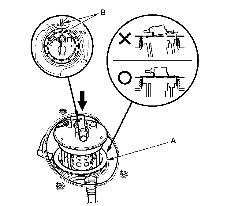 3. Align the marks (B) on the fuel tank and the fuel tank unit, then insert the fuel tank unit into the fuel tank until the fuel tank unit rests on top of the base gasket.