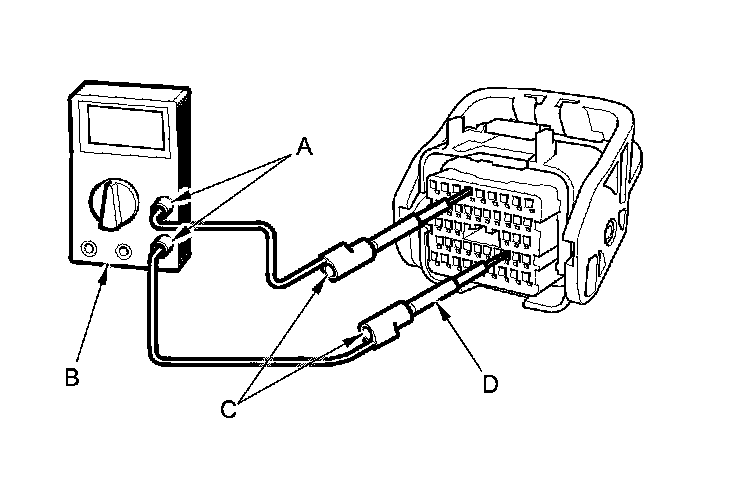 6. Connect one side of the patch cord's terminals (A) to a commercially available digital multimeter (B), and connect the other side of the terminals (C) to a commercially available banana jack (Pomona Electronics Tool No. 3563 or equivalent) (D).