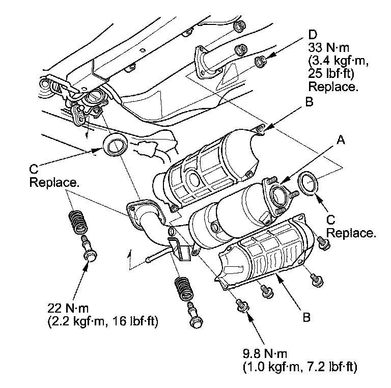Install the parts in the reverse order of removal with new gaskets (C) and new self-locking nuts (D).