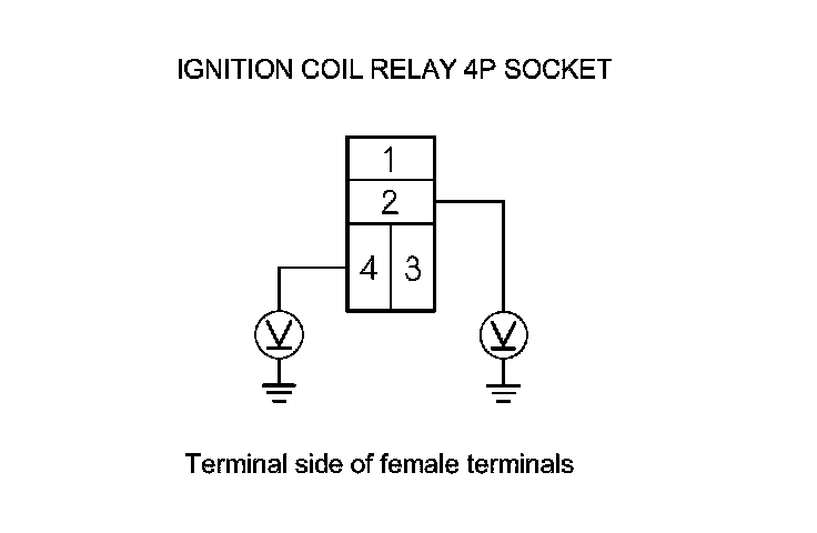 3. Measure the voltage between ignition coil relay 4P socket terminal No. 2 and body ground, then terminal No. 4 and body ground.