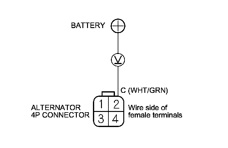 7. Measure the voltage between alternator 4P connector terminal No. 2 and the positive terminal of the battery.