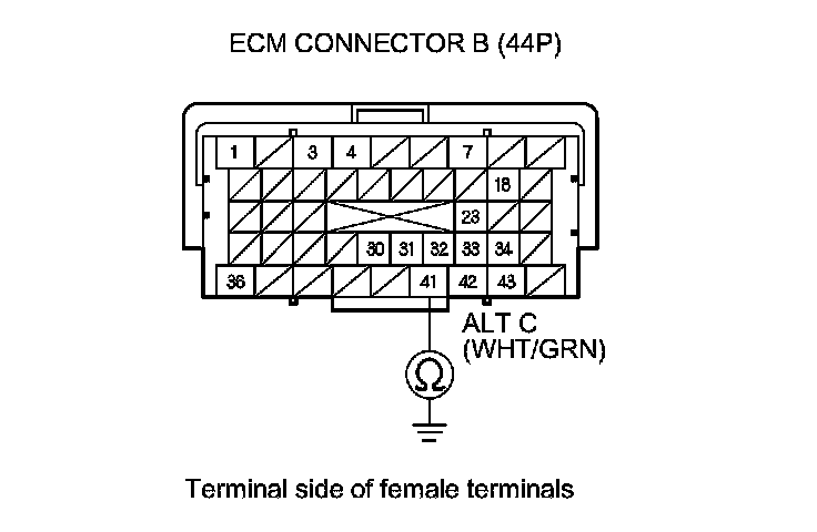 13. Check for loose terminal and connectors, then check for continuity between ECM connector terminal B41 and alternator 4P connector terminal No. 2.