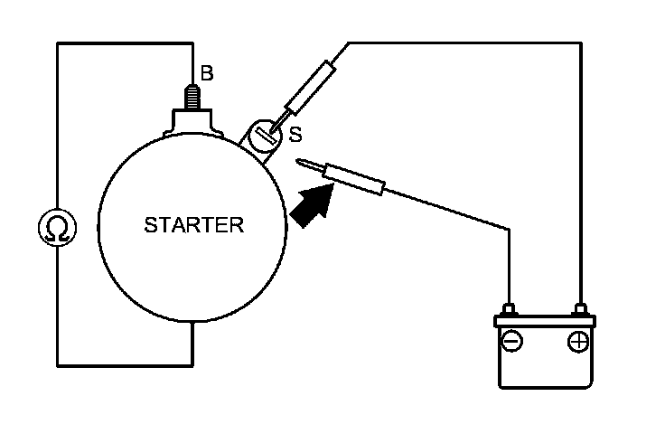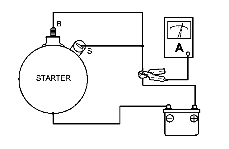 4. Connect the battery as shown, and check for continuity between the B terminal and the starter body. If there is continuity, it is working properly.