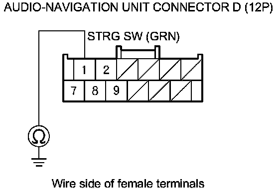 5. Measure the resistance between the audio-navigation unit connector D (12P) terminal No. 1 and body ground in each switch position according to the table.