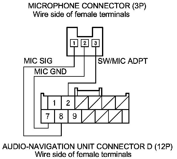 8. Check for continuity between navigation unit connector D (12P) and the microphone connector (3P) according to the table.