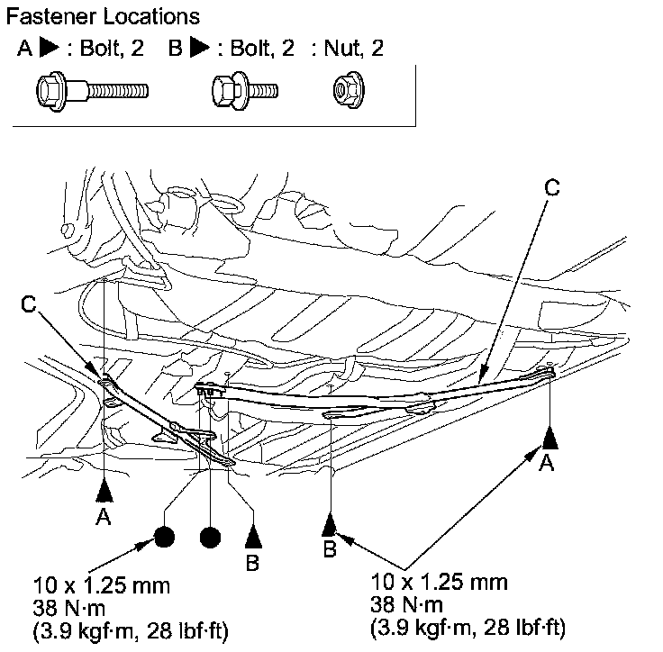 2. Remove the bolts (A, B) and the nuts ('11 model), then remove the trailing arm braces (C) from the body.