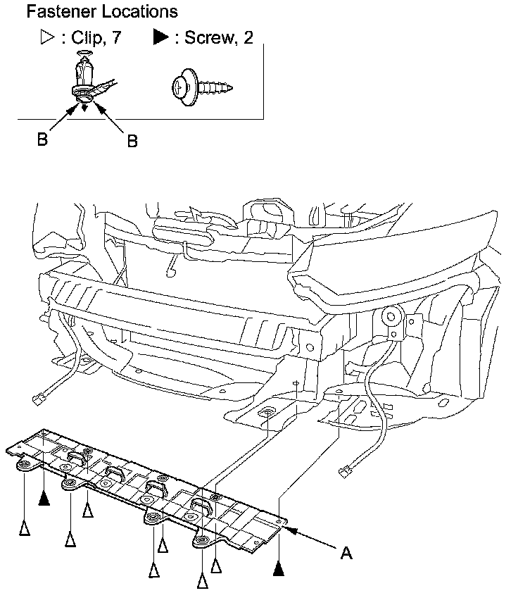 2. Remove the clips and the screws, then remove the front bulkhead lower cover (A).