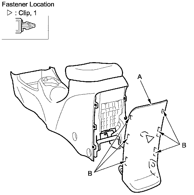 2. Gently pull out the center console rear trim (A) to detach the hooks (B) and the clip.