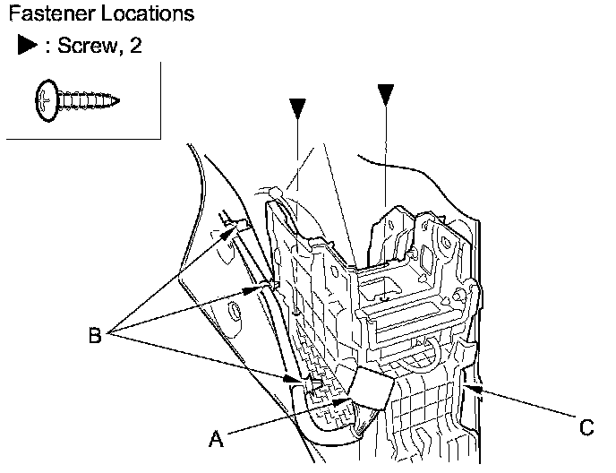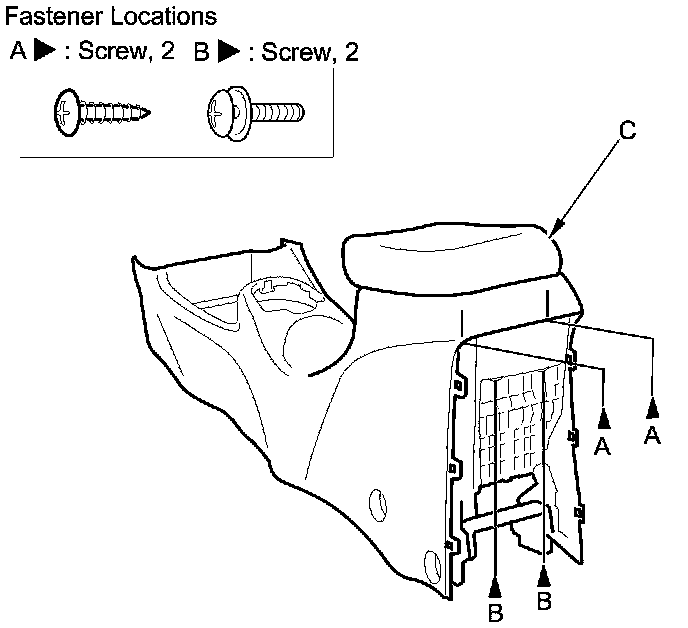 3. Remove the screws (A, B), then remove the center console armrest (C).