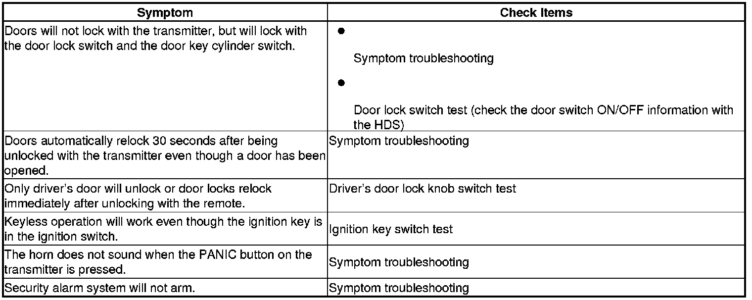 Keyless/Power Door Locks/Security System Symptom Troubleshooting Index