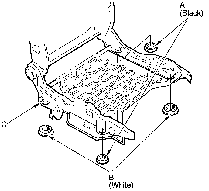 6. If necessary, remove the bushings (A, B) from the seat cushion frame (C).