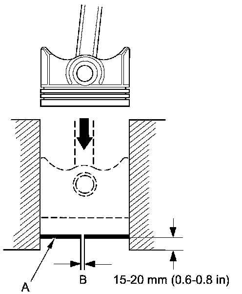 4. Using a piston, push a new ring (A) into the cylinder bore 15-20 mm (0.6-0.8 in) from the bottom.