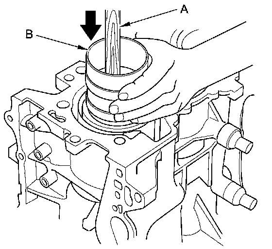 Maintain downward force on the ring compressor (B) to prevent the rings from expanding before entering the cylinder bore.