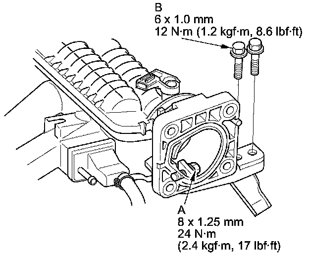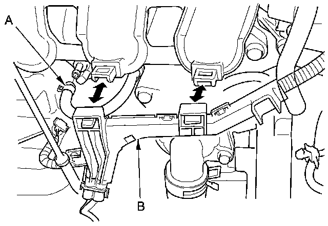 4. Loosen the intake manifold bracket mounting bolt (A). Tighten the mounting bolts (B), then tighten the mounting bolt (A).