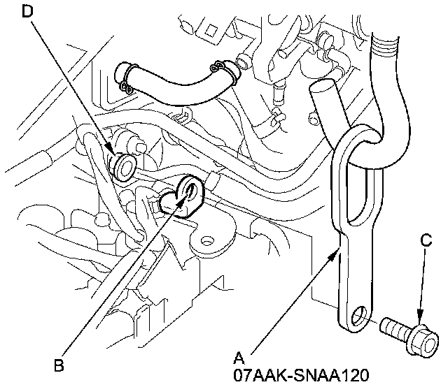 7. Attach the second universal lifting eyelet (A) to the air cleaner bracket hole (B) with a bolt (C) and a nut (D).