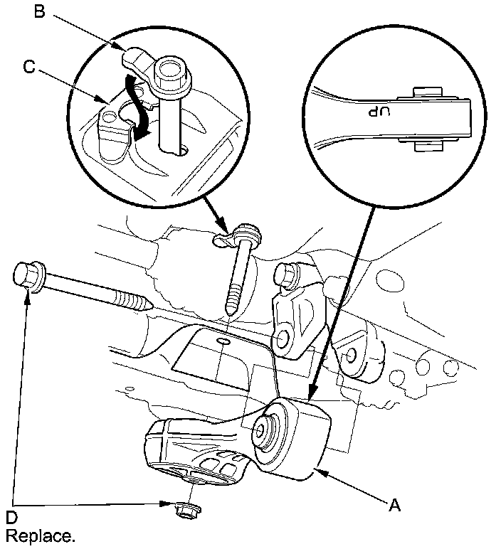 16. Install the torque rod (A). Install the bolt with the tab (B) on the bolt head aligned with the guide (C) on the front subframe, then loosely install the new torque rod mounting bolt and nut (D).