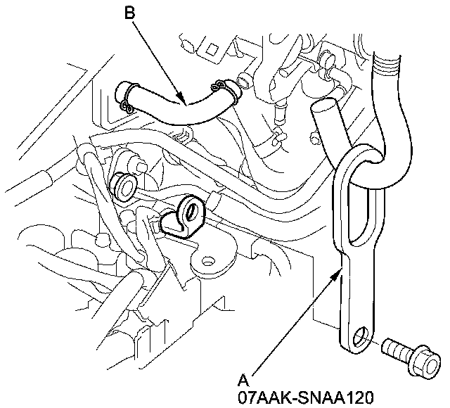 20. Remove the second universal lifting eyelet (A), and install the canister purge hose (B).