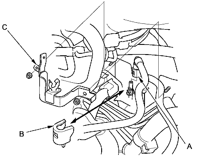 46. Install the PCM (A), then install the harness holder (B) and the harness clamp (C).