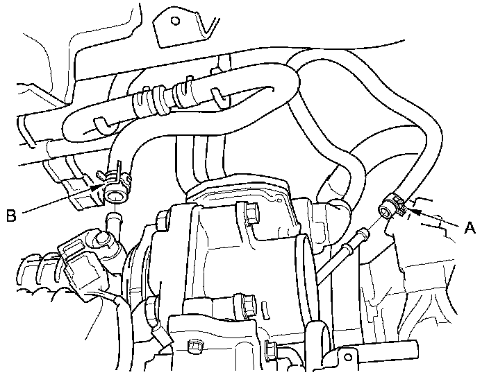 45. Install the EVAP canister hose (A) and the brake booster vacuum hose (B).