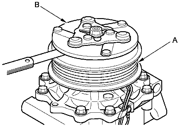 3. Measure the clearance between the rotor pulley (A) and the armature plate (B) all the way around. If the clearance is not within specified limits, remove the armature plate Service and Repair and add or remove shims as needed to increase or decrease clearance.
