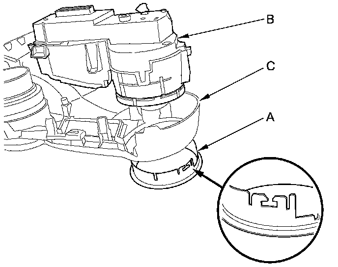 4. Remove the ring cover (A), and detach the climate control unit (B) from the instrument panel (C).
