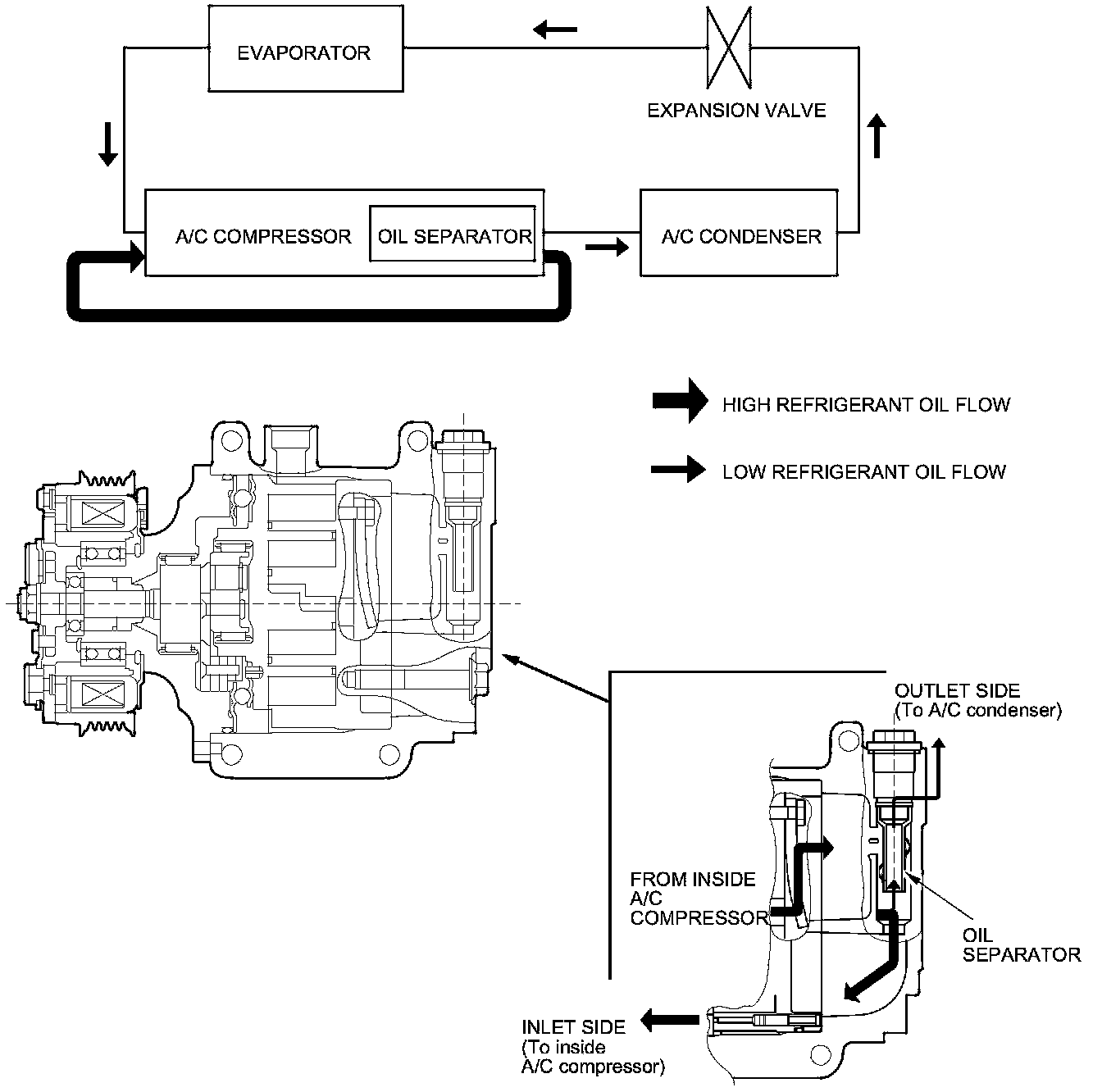 Oil emission from the A/C compressor to the A/C line is reduced by placing the oil separator in the A/C compressor. This results in a thinner oil film inside of the heat exchangers (A/C condenser and evaporator). Air conditioning efficiency is increased without sacrificing engine performance.