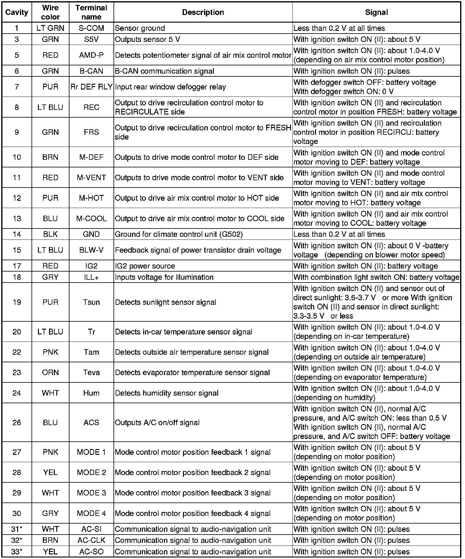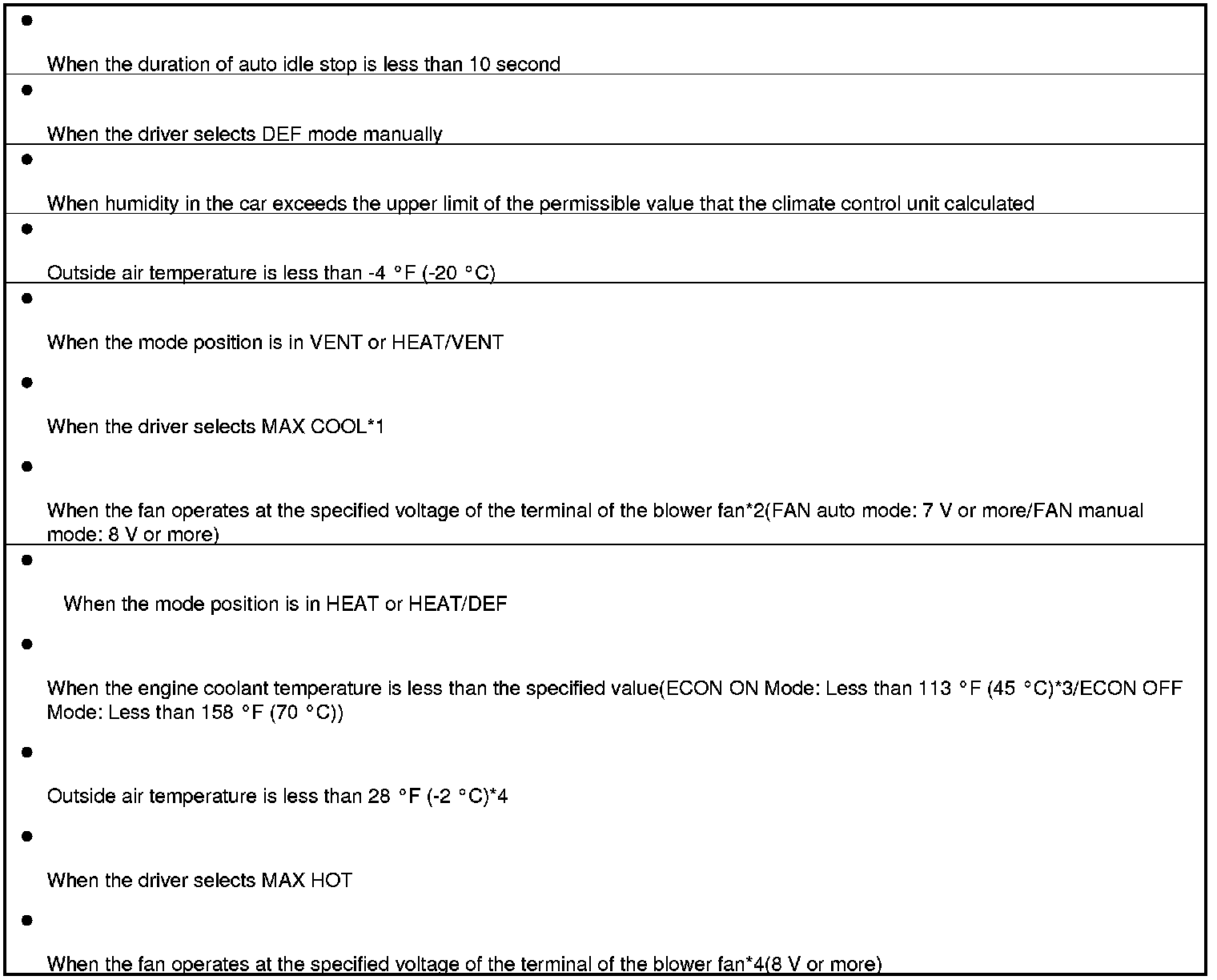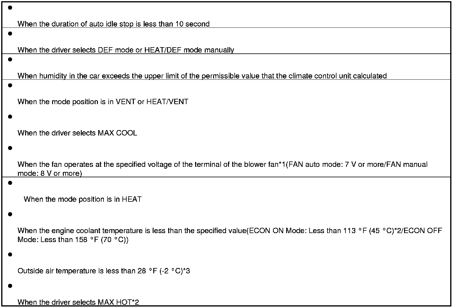 The air conditioning system disables auto idle stop under any one of the following conditions. But the climate control unit enables auto idle stop when the blower motor is off.