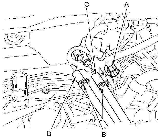 4. From the inlet heater hose, remove the clip (A). Slide the hose clamps (B) back, then disconnect the inlet heater hose (C) and the outlet heater hose (D) from the heater unit. Note the layout of the hoses.