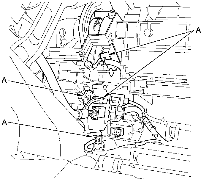 7. Disconnect these connectors (A): The mode control motor, the power transistor, the evaporator temperature sensor, and the air mix control motor.