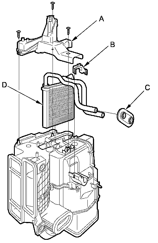 9. Remove the self-tapping screws and the heater core cover (A), the cap (B), and the grommet (C), and carefully pull out the heater core (D).