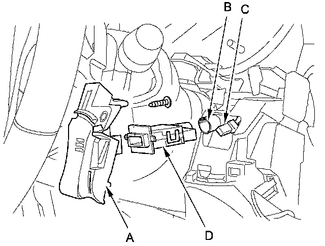 4. Remove the self-tapping screw and the humidity/in-car temperature sensor (D) from the humidity/in-car temperature sensor trim (A).