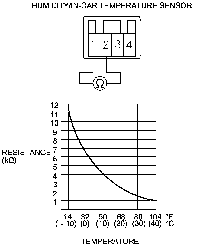 3. Compare the resistance reading between terminals No. 1 and No. 2 of the humidity/in-car temperature sensor with the specifications shown in the graph; the resistance should be within the specifications.