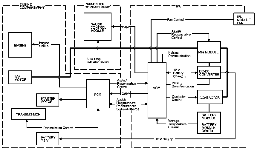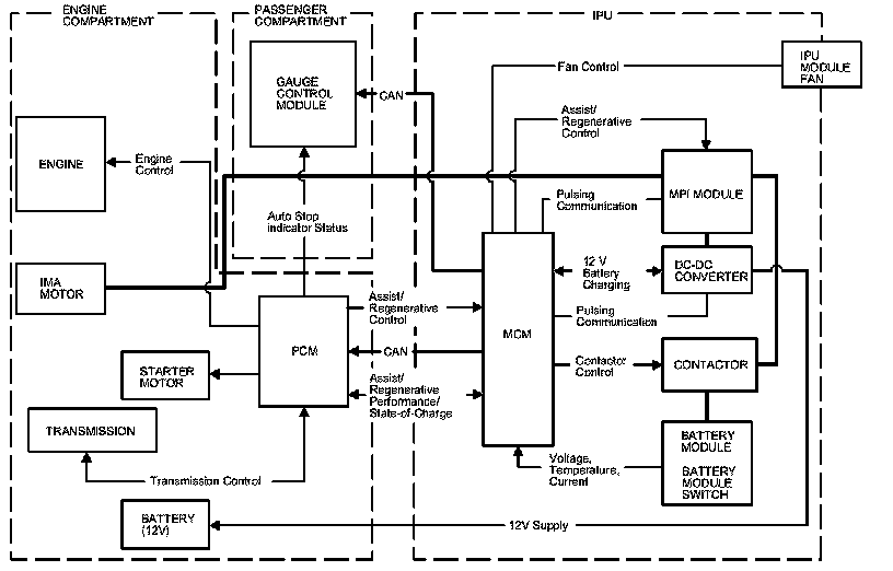 The IMA system drives the IMA motor and starts the engine during normal starts and when re-starting from an idle stop. The IMA motor is linked directly to the engine crankshaft.