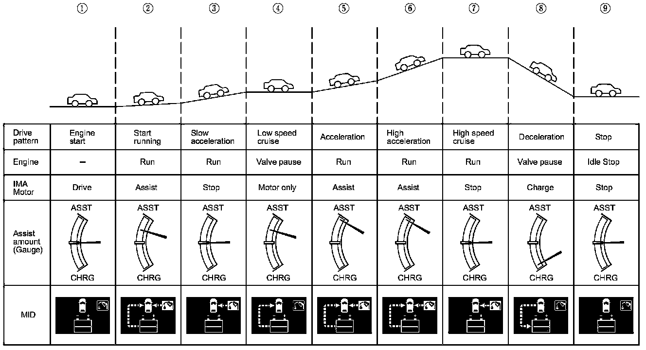 At a constant speed of about 25 mph (40 km/h) with light load, all engine cylinders are deactivated, and the vehicle runs only with the IMA motor. When the state-of-charge (SOC) drops, the engine starts and the IMA motor begins to charge the battery module.