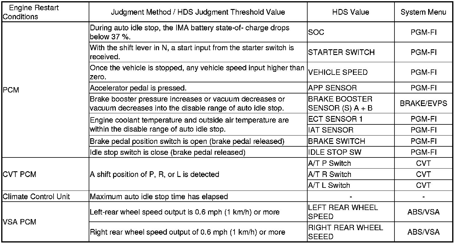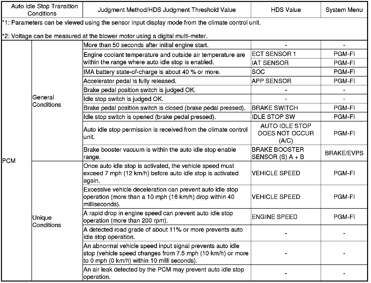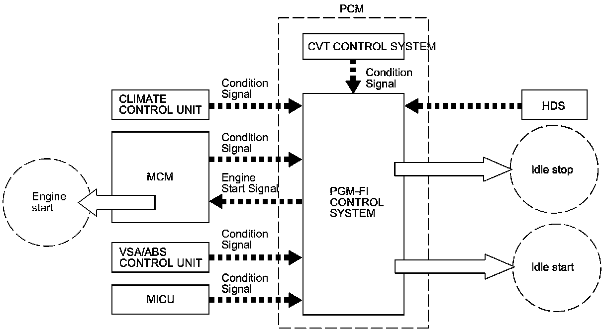 Based on inputs from various sensors and control units, the PCM may or may not allow auto idle stop under different operating conditions.