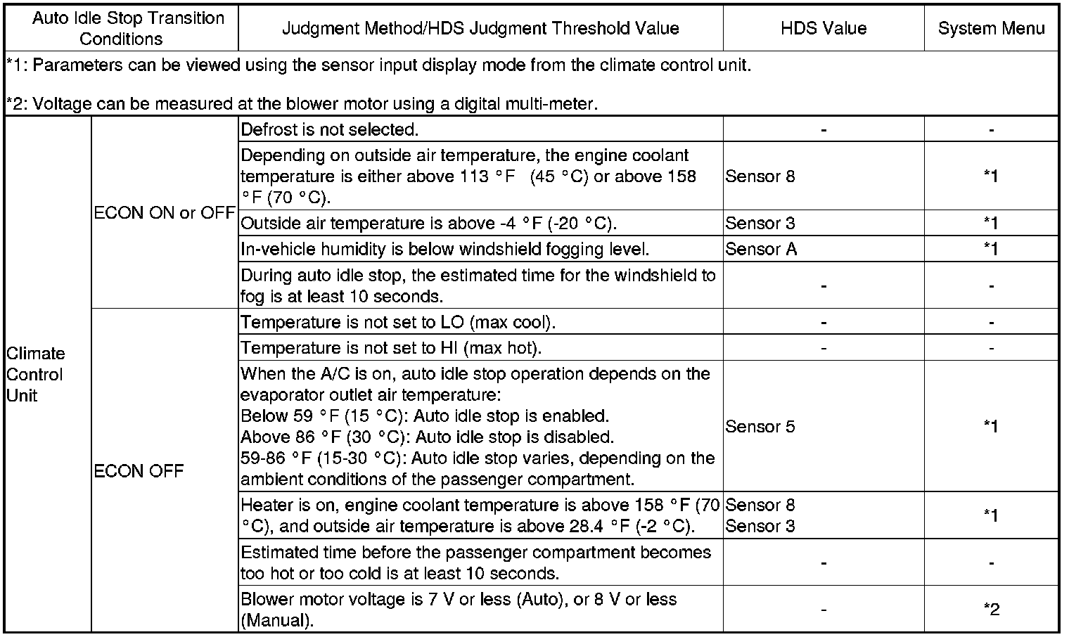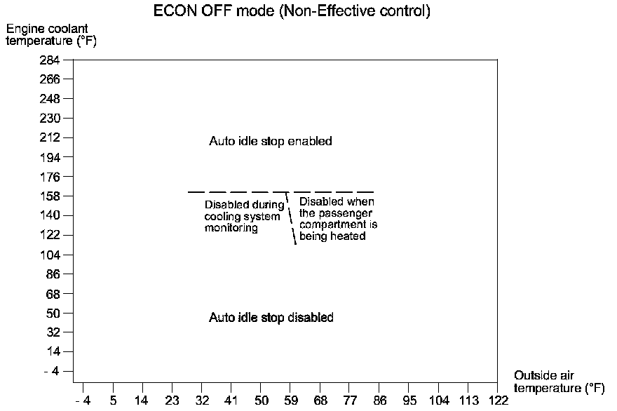Auto idle stop is disabled by the PCM when the engine coolant and the outside air temperatures are in the range shown below. The thresholds vary, depending on whether ECON ON or ECON OFF is selected.
