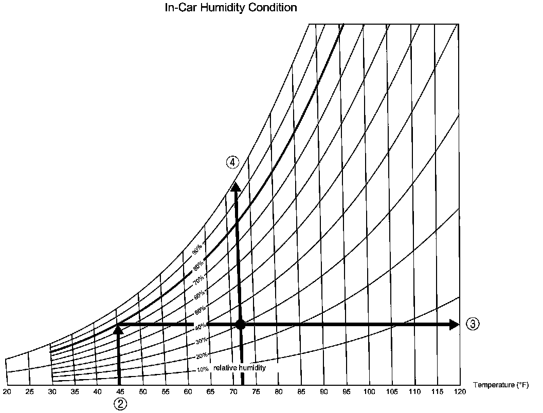 Auto idle stop is disabled when the climate control unit anticipates windshield fogging. The threshold depends on outside air temperature, the in-vehicle temperature, and the in-vehicle humidity. To determine the approximate auto idle stop threshold for the ambient conditions of the vehicle, use the instructions and the graph below: