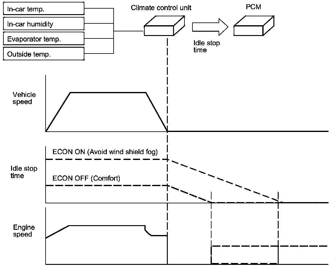 The climate control unit calculates a maximum time for auto idle stop. This time depends on whether ECON ON or ECON OFF is selected.